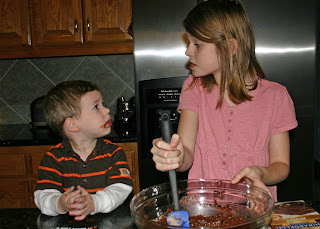Here comes the brownie mix...look at Tristan's face